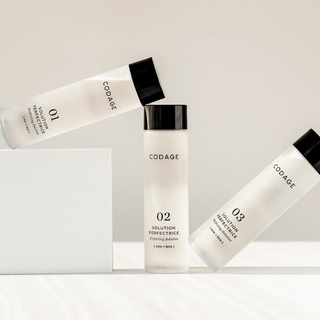 The PERFECTING SOLUTION N°02 is a pre-treatment care composed of targeted active ingredients. A right concentration of fruit acids (AHA) and salicylic acid (BHA), combined with zinc and soothing agents help to eliminate dead skin cells and imperfections, day after day, while tightening pores, rebalancing sebum production, revealing radiance and respecting the most sensitive skin.